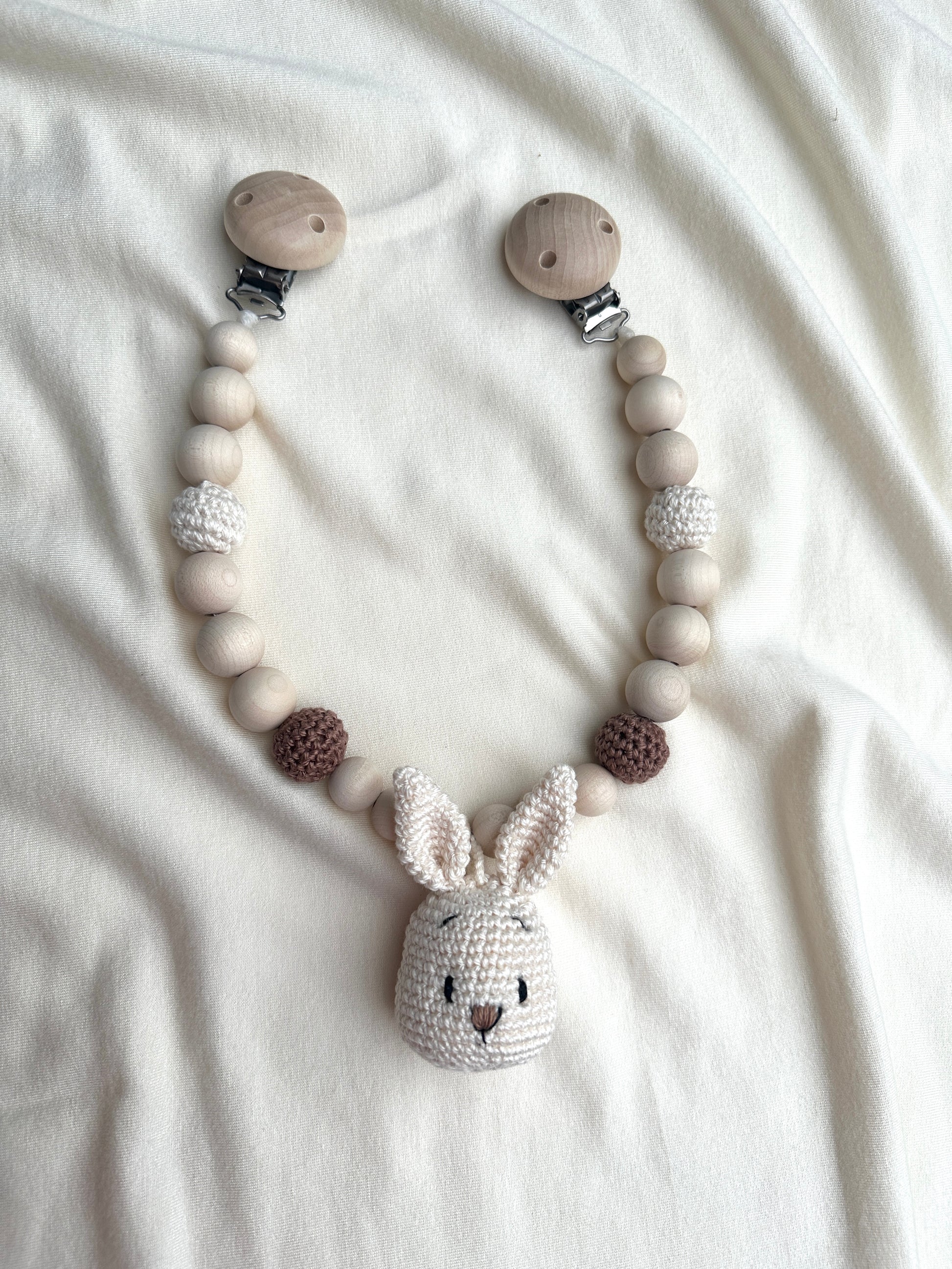 Die Kette lässt sich ganz einfach mit zwei Holzclips an jedem Kinderwagen befestigen. Die Kinderwagenkette hat eine maximale Länge von 40 cm (ohne Clips)