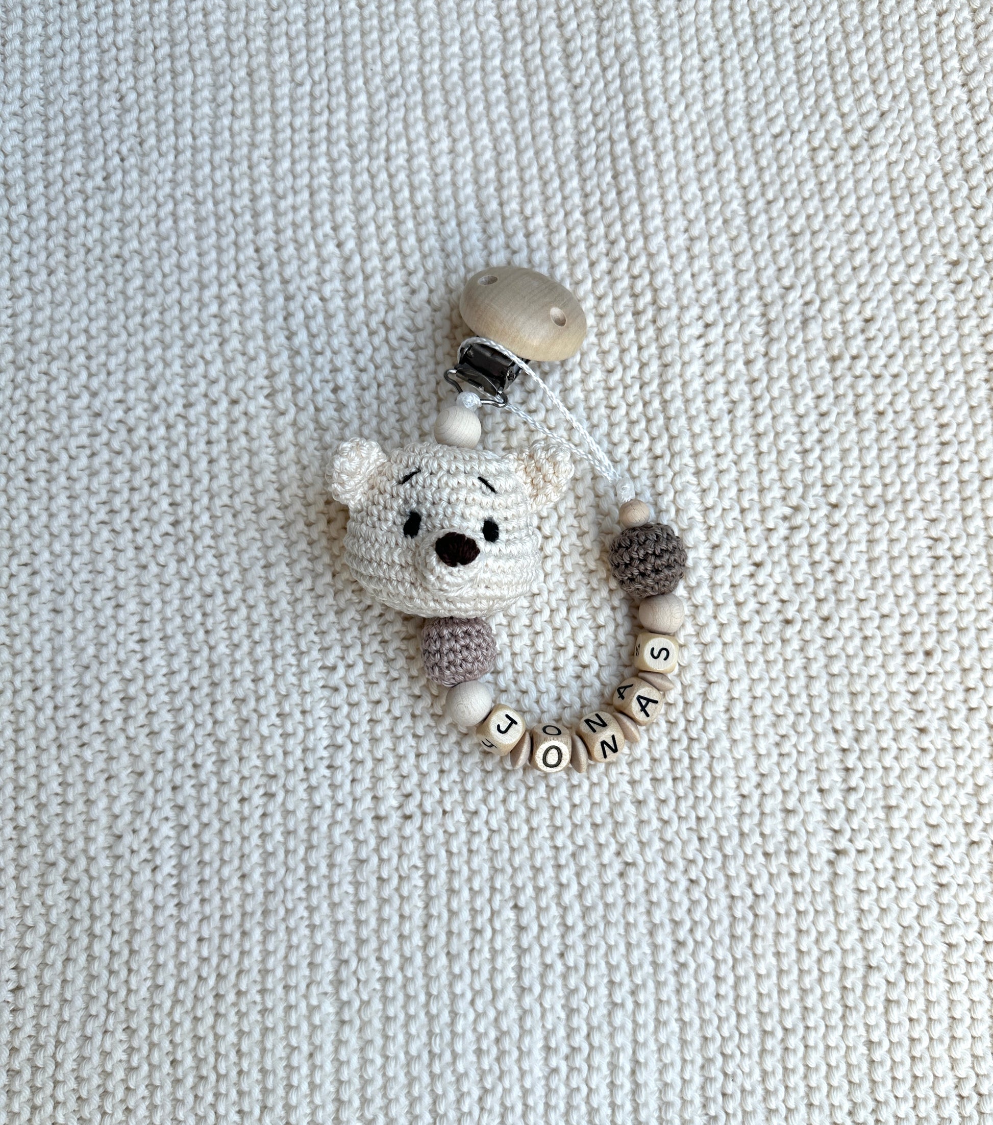 Jedes einzelne Stück wird in liebevoller Handarbeit angefertigt. Die wunderschöne Schnullerkette “TEDDY“ ist ein Hingucker für jeden Schnuller und ein tolles Accessoire für jedes Baby. Eignet sich perfekt als Geschenk zur Geburt oder Taufe. Unsere einzigartigen Schnullerketten werden das Neugeborene die erste Zeit begleiten und anschließend als schöne Erinnerung aufgehoben.