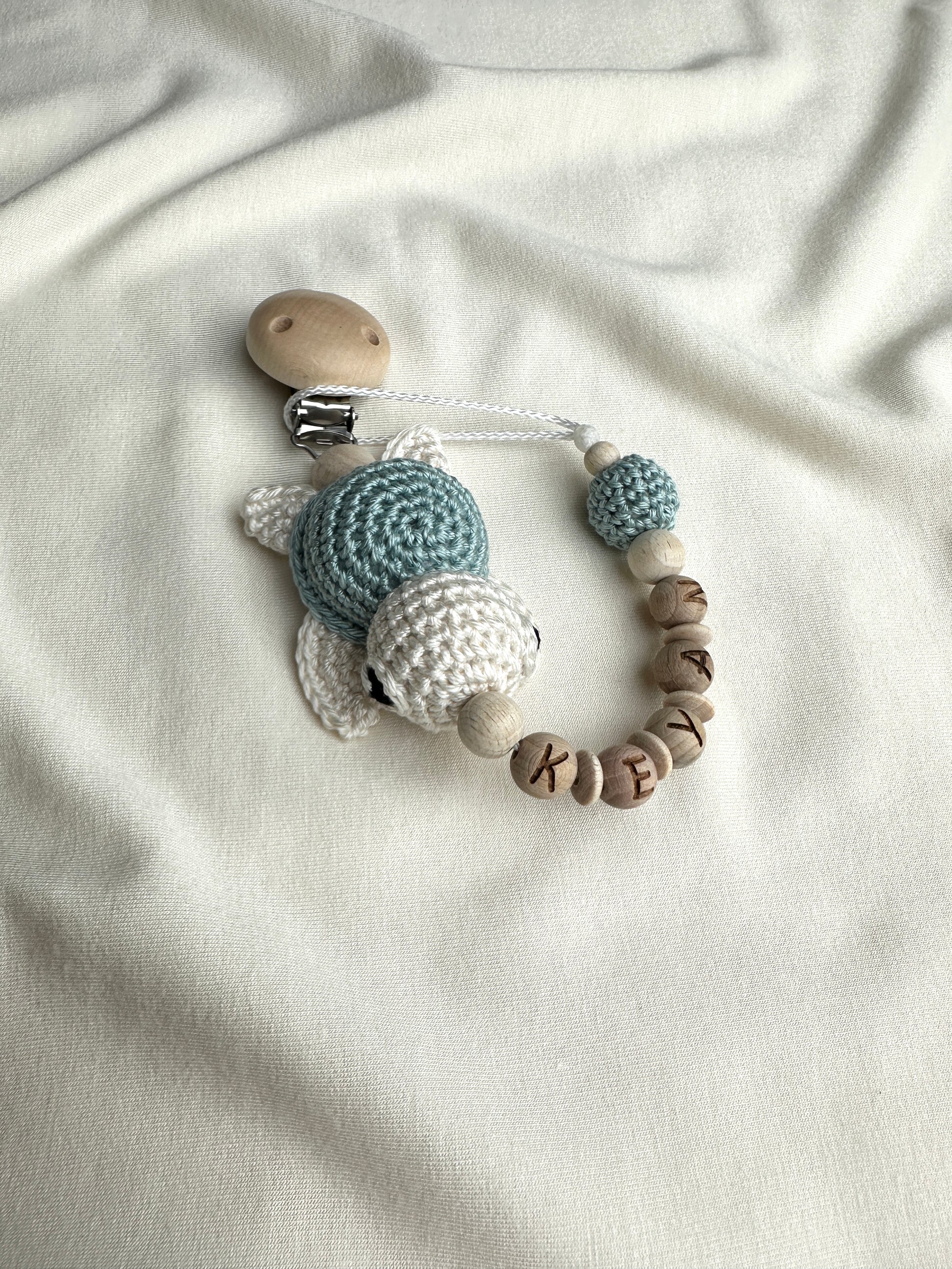 Es können nur Schnullerketten und Kinderwagenketten personalisiert werden. Bitte beachte, sofern keine Personalisierung erwünscht ist, werden die Buchstabenperlen durch runde Holzperlen ersetzt. Je nach Länge des Namens kann die Reihenfolge der Perlen abweichen, das Farbkonzept bleibt weiterhin bestehen. Unter Beachtung der gesetzlichen Normen für die Sicherheit des Baby‘s darf die vorgegebene Maximallänge der Schnullerkette nicht überschritten werden. Aus diesem Grund ist die Buchstabenanzahl auf 9 beschränkt.