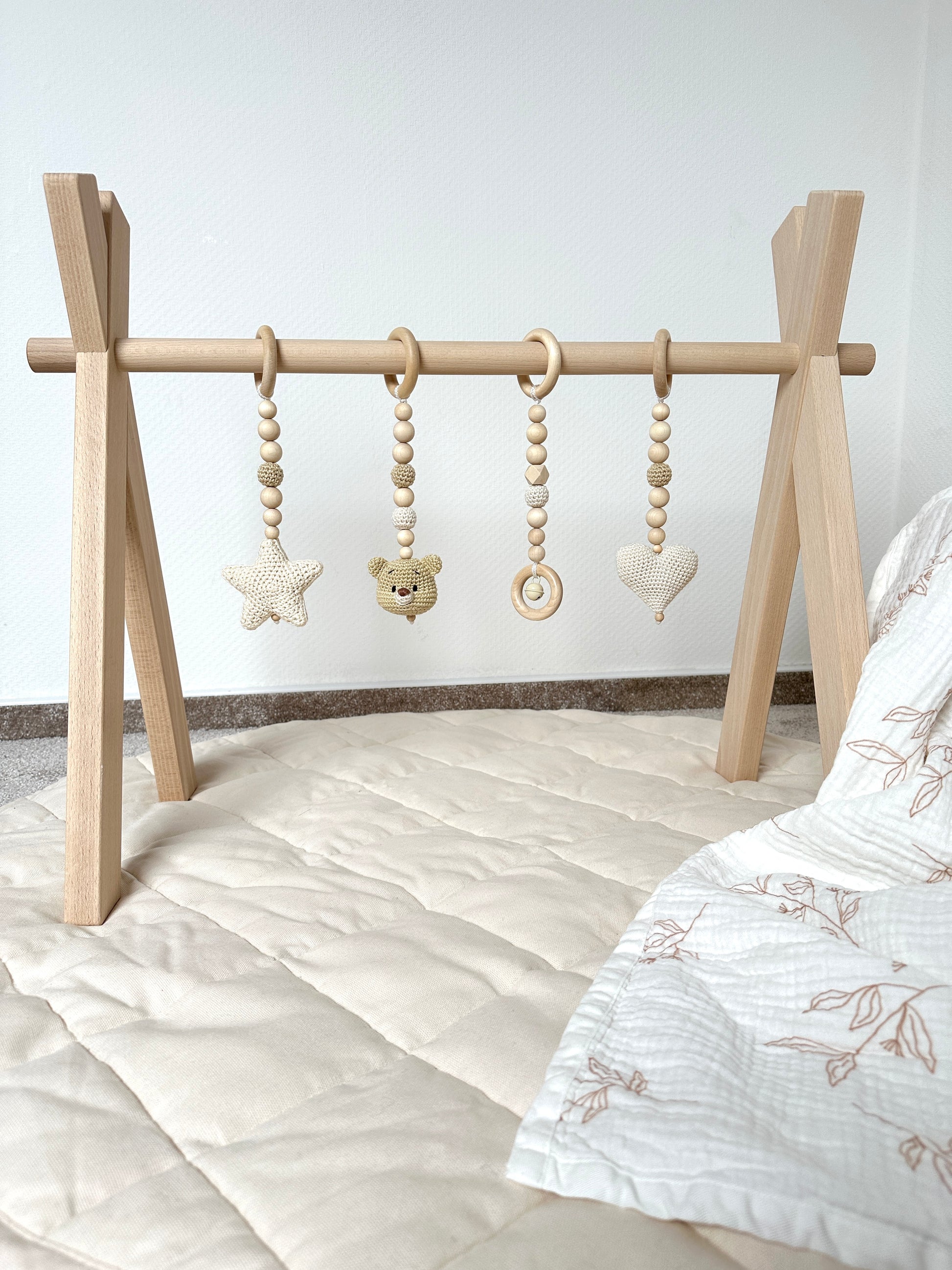 Entdecke unseren liebevoll gestalteten Spielbogen „TEDDY“. Hergestellt in höchster Qualität aus unbehandeltem Buchenholz. Zusammen mit unseren vier handgefertigten Anhängern eignet es sich nicht nur hervorragend zum Spielen für dein Baby, sondern unterstützt gleichzeitig die motorische und sensorische Entwicklung.