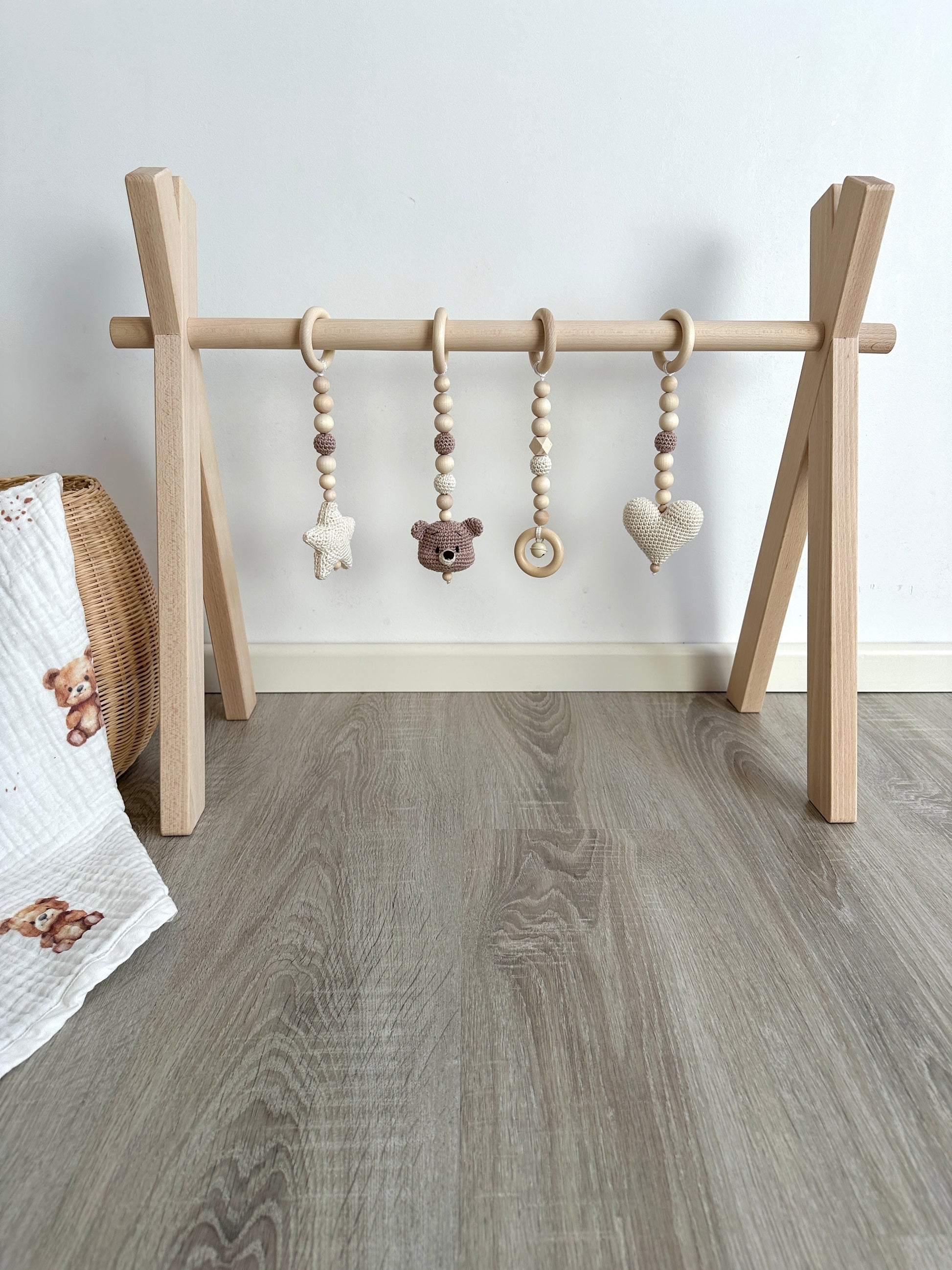 Entdecke unseren liebevoll gestalteten Spielbogen „TEDDY“. Hergestellt in höchster Qualität aus unbehandeltem Buchenholz. Zusammen mit unseren vier handgefertigten Anhängern eignet es sich nicht nur hervorragend zum Spielen für dein Baby, sondern unterstützt gleichzeitig die motorische und sensorische Entwicklung.