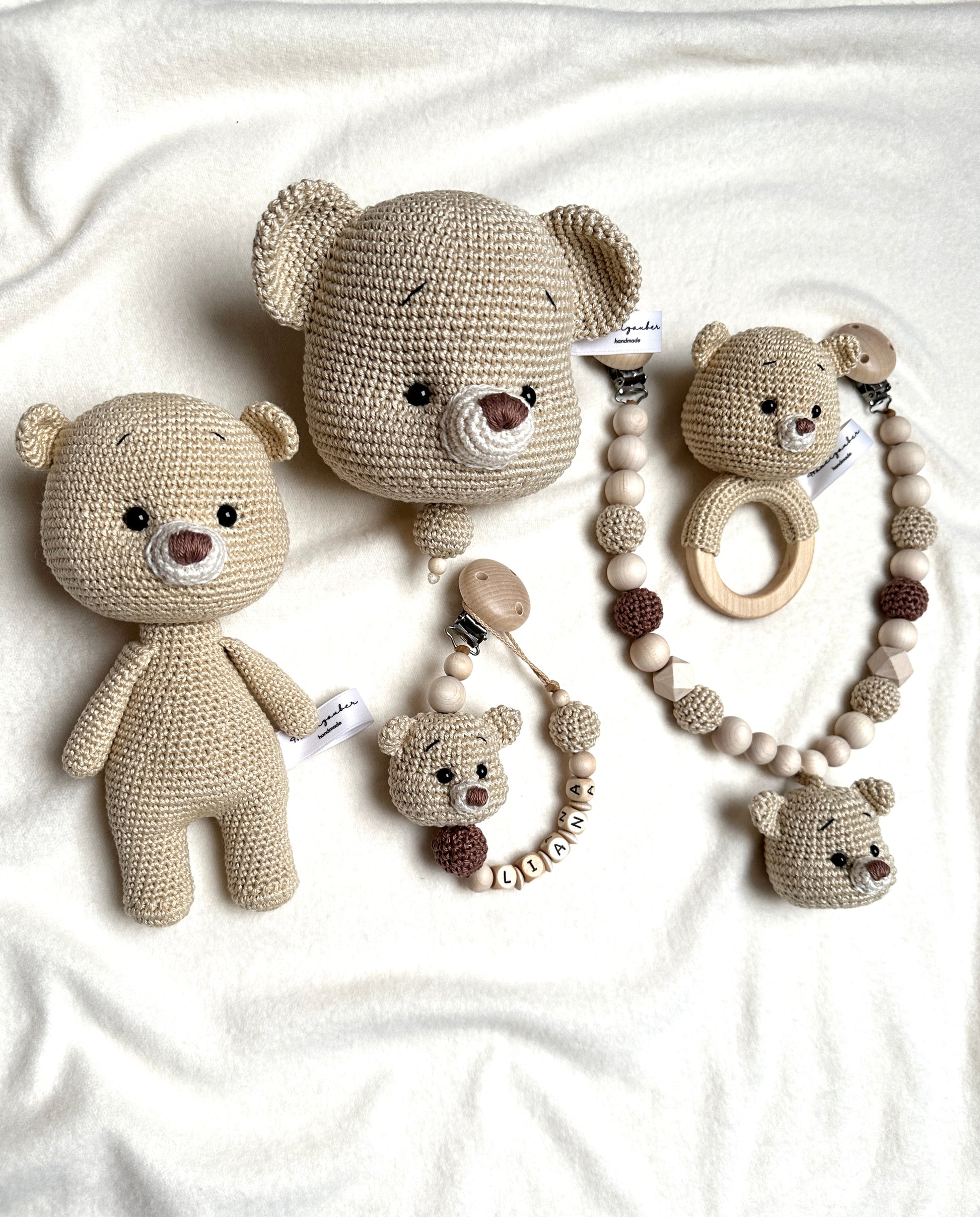 Jedes einzelne Produkt wird mit viel Liebe und Sorgfalt hergestellt. Unter Verwendung hochwertiger Materialien entstehen unsere individuellen Lieblingsstücke. Ob als Geschenk oder für den eigenen Gebrauch ist das Set „TEDDY“ ein wunderbarer Begleiter für die kleinsten unter uns.